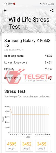 Beralih ke Wild Life Stress test, skor tertinggi yang dicapainya adalah 4.595 poin. Dari grafik yang ditampilkan performa Adreno 660 cenderung naik turun selama pengujian, wajar jika 3DMark menuliskan stabilitas 75,1% saja. Suhu selama pengetesan meningkat 3° C dengan pencapaian frame rate tertinggi 41 FPS.
