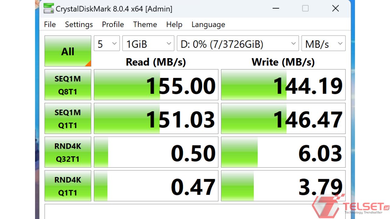 Dari pengujian CrystalDiskMark terlihat bahwa kemampuan membaca hard drive ini paling tinggi berada di 155MB/s, dan menulis data di angka 144,19MB/s. Dari sini, terbilang hard disk memiliki performa yang bisa diandalkan.