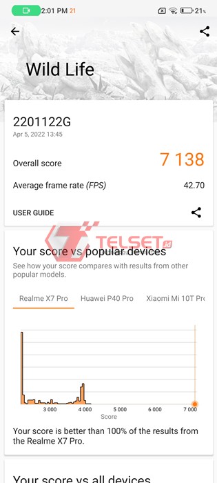 Sementara untuk pengujian kartu grafis dalam hal ini Adreno 730, kami menggunakan dua tes yang berbeda, yakni Wild Life dan Wild Life Stress Test. Dari tes Wild Life, smartphone ini memperoleh angka 7.138 poin dengan rata-rata frame rate 42,7 FPS.