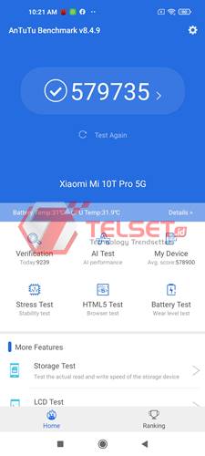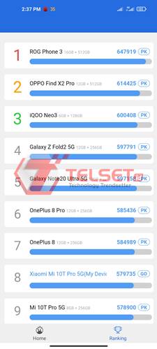 Ditenagai prosesor Snapdragon 865, skor AnTuTu dari Xiaomi Mi 10T Pro sudah pasti tinggi. Smartphone ini meraih skor 579.735 poin dan berhasil menempati posisi ke-8 sebagai smartphone paling kencang di AnTuTu berdasarkan fitur Ranking.
