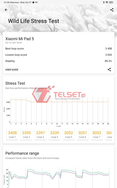 Untuk Wild Life, tablet ini mendapatkan skor rata-rata 3.405 poin dengan frame rate rerata 20,4 FPS. Terlihat dari grafik, frame rate dari Pad 5 cenderung cukup stabil dengan titik tertinggi berada di 26 FPS.