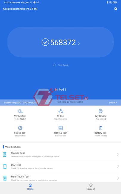 Xiaomi Pad 5 mencatatkan skor 568 ribuan poin. Kalau dibandingkan dengan dua tablet dengan spesifikasi kelas atas yang pernah kami review, tablet Xiaomi ini tertinggal skornya dengan Huawei MatePad 11 dan Samsung Galaxy Tab S7.