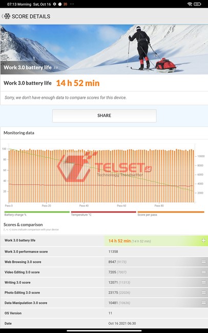 Well, itu untuk pemakaian in real life. Sementara pengujian menggunakan PCMark Battery Test, tablet ini mencatatkan waktu 14 jam 52 menit dengan baterai tersisa 20%.