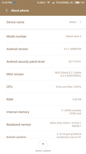 Selain Snapdragon 625, mesin utama Redmi Note 4 pun sudah disokong oleh RAM 3GB, memori internal 32GB yang bisa diperluas hingga 128GB menggunakan microSD serta baterai besar berkapasitas 4,100 mAh. Spesifikasi tersebut disematkan perusahaan asal China itu demi melancarkan semua proses yang berjalan di atas MIUI 8.0 berbasis Android 6.0 Marshmallow.
