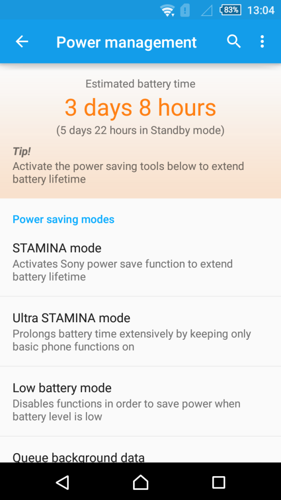 Untuk menjaga agar tidak kemasukan air saat dibawa berenang, ponsel ini memiliki baterai yang tidak bisa dicopot. Kapasita baterai tersebut berukuran 2400 mah dengan daya tahan mencapai 2 hari apabila mengaktifkan fitur Modus STAMINA. Sedangkan waktu bicara pada jaringan 3G mencapai 13 jam 17 menit yang mampu memenuhi kebutuhan komunikasi dan hiburan selam satu hari, asalkan tidak digunakan untuk bermain game secara terus menerus.