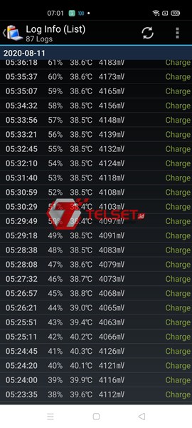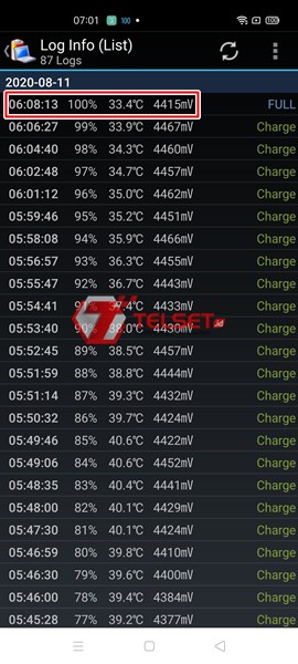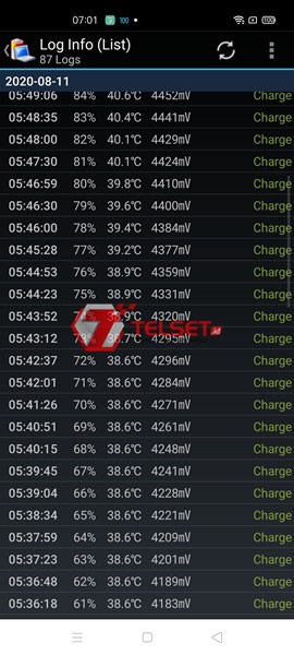 Dalam menghitung kecepatan charging dari Oppo Reno4, kami menggunakan bantuan aplikasi Battery Log. Aplikasi ini membantu kami untuk mencatat aktivitas baterai secara presisi. Terdapat informasi seperti waktu, persentase baterai, suhu, hingga tegangan dari baterai.