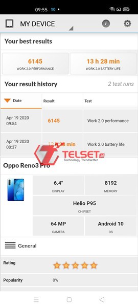 Oppo Reno3 pro memperoleh skor 6.145 poin untuk PCMark Work 2.0 Performance. Perolehan skor tersebut tergolong bagus. Smartphone ini berarti memiliki kemampuan yang baik dalam hal mendukung berbagai aktivitas normal pengguna, termasuk multi-tasking.