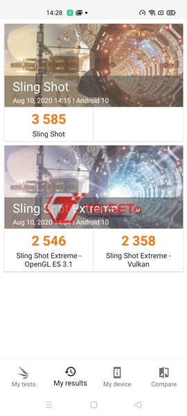 Performa GPU dari Oppo Reno4 pun sudah mumpuni. Berdasarkan penilaian dari 3DMark, smartphone ini memperoleh skor 3.585 poin untuk pengujian Sling Shot, 2.546 poin untuk Sling Shot Extreme OpenGL ES 3.0, dan 2.358 poin untuk Vulkan.