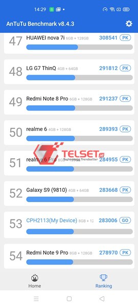 Berdasarkan menu ranking di aplikasi, perolehan benchmark Oppo Reno4 lebih baik dari Redmi Note 9 Pro (278.970), Huawei P20 Pro (274.240), sampai Mi Note 10 (270.241). Namun, skornya masih kalah dari Realme 6 Pro (284.955) sampai Redmi Note 8 Pro (291.237).