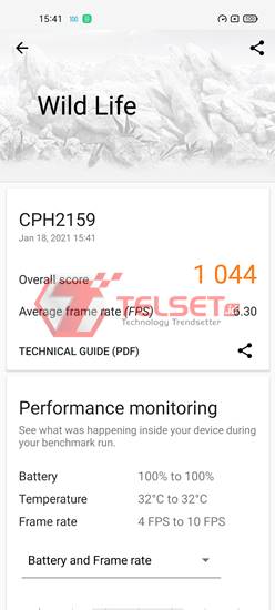 Dari pengujian menggunakan skema Wild Life Stress Test, Oppo Reno5 pun memiliki tingkat Stability hingga 99,7%. Sedangkan untuk Wild Life, ponsel pintar ini mendapatkan Average FPS 6.30 poin saja.